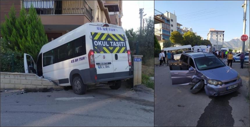 Denizli’de Merkezefendi ilçesine bağlı Mehmet Akif Ersoy Mahallesi’nde F.L. idaresindeki 20 S 1044 plakalı okul servisi, Y.K. kontrolündeki 20 AGV 118 plakalı otomobille 57. Sokak ve 65/2 sokak kesişiminde çarpıştı. Çarpışma etkisiyle içerisinde öğrencilerin bulunduğu servis bir apartmanın duvarını kırarak bahçeye uçtu. İhbar sonrası bölgeye polis ve sağlık ekipleri sevk edildi. Kazada yaralanan 2 sürücü ve serviste bulunan 12 öğrenci kentteki farklı hastanelere kaldırıldı. Yaralıların durumunun iyi olduğu öğrenilirken, kazayla ilgili ekiplerce soruşturma başlatıldı.