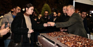 KYK Amfi Park’ta düzenlenen gecede gençleri yalnız bırakmayan Başkan Osman Zolan, burada öğrenci ve vatandaşlara kestane ikram etti.